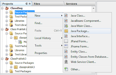 Langkah selanjutnya buat package caranya seperti gambar dibawah ini. Pada kolom project klik Source Package - klik kanan pada mouse - klik New - pilih Java Package.